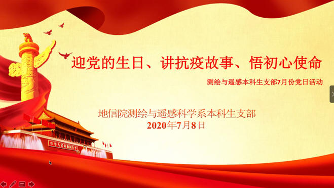 2020年7月8日下午3点,地信院测绘与遥感本科生支部顺利召开“迎党的生日、讲抗议故事、悟初心使命”7月份党日活动。活动分三部分展开,第一部分是邀请参与过战疫的同志分享自己的故事经历;第二部分是支部其他同志发表感想;第三部分是支部书记何可沁同志总结此次活动。