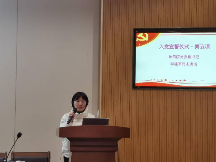 地信院分党校预备党员入党宣誓仪式在地科楼127报告厅顺利举行,地信院党委副书记李建军同志、地质资源系本科生支部书记杨晨雨同志、2022年新发展的预备党员参加宣誓仪式,会议由杨晨雨同志主持。