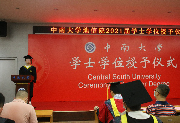 接下来,在副院长邹滨宣布拟授予学士学位的学生名单后,优秀学生代表遥感1701班薛琛昊发言,他回忆了这四年里与中南、与地信、与同学相处的点点滴滴,自己对于学校、对于老师的感激之情溢于言表,同时他也真挚地祝愿同学们前程似锦。