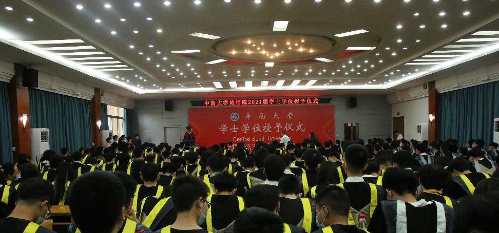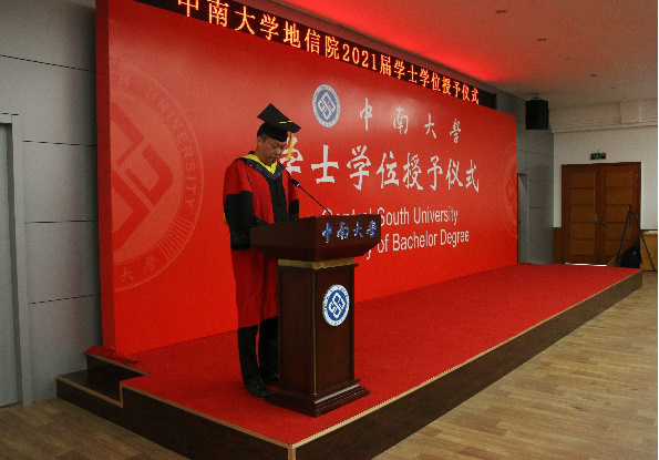 2021届毕业生毕业典礼暨学位授予仪式在校本部立言厅隆重举办,地信院党委书记邵拥军,院长戴前伟,党委副书记李建军,副院长邹滨,地质工程系孙平贺老师,测绘与遥感科学胡俊、冯徽徽、杨泽发老师,应用地球物理系冯德山、任政勇、肖建平、李帝铨、郭振威、张彬老师,地理信息系邓敏、张宝一、刘慧敏、陈杰老师,以及学工办全体辅导员与21届全体毕业生参加此次毕业典礼暨学位授予仪式。仪式由李建军副书记主持。