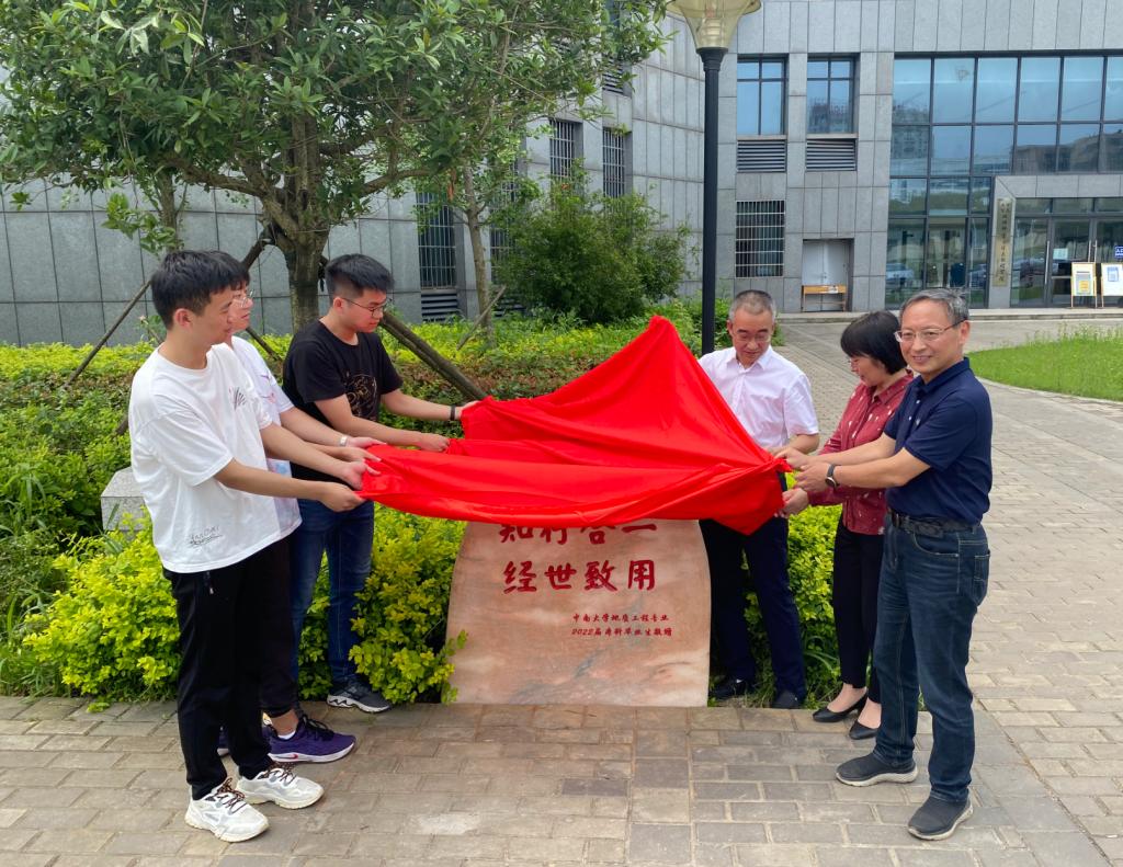 感谢地质工程专业全体毕业生对母校的感恩之情。他表示,此次校训石是地信院历史上首次由应届毕业生捐赠,寓意极为深刻。他同时勉励全体毕业生,继续秉承“知行合一,经世致用”的校训精神,只争朝夕,勇于实践,将在校所学所思所悟转变为解决实际问题的方法和路径,并将实际中的困难转化成为自己解决复杂工程问题的能力。