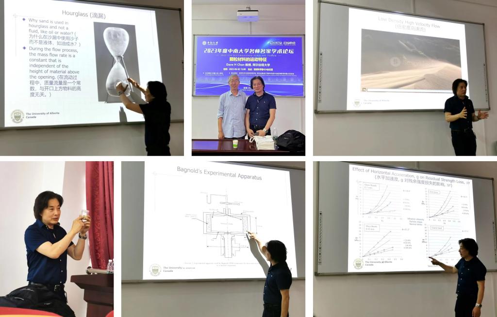 Dave Chan教授以《The Motion Characteristics of Granular Material》(颗粒材料运动特征)为主题,从数值计算、物理实验及地质灾害案例等多角度阐述了颗粒材料力学行为最新研究成果,介绍了泥石流等典型颗粒流在运动过程中的颗粒惯性、粒间摩擦、体变行为与振动效应等前沿热点问题,总结了颗粒材料运动过程本构模型、内应力计算、流固耦合等方面的研究挑战。报告内容深入浅出,具有极高的学术水平,会场学术氛围浓厚,与会师生提出了近20个问题,Dave Chan教授一一作答并与现场师生热烈讨论,并从其自身研究经验出发提出了独到见解。