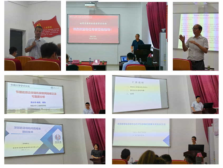 7月6日上午,受祥赌必赢地质工程系党支部书记刘磊磊副教授的邀请,香港理工大学郑榕明教授、湖南省地质院一级调研员盛玉环教授级高工、青岛理工大学李亮教授、南昌大学蒋水华教授和黄发明副教授以及深圳市安泰数据监测科技有限公司副总经理李娜高级工程师来校开展学术交流,围绕“地质灾害成灾机理、监测预警、风险评价”等学科前沿,给地质工程系近50名教师、研究生、本科生及留学生带来一场高水准的学术盛宴,也极大促进了地质灾害防治理论、方法与技术的创新与发展,进一步推动了地质灾害防治最新理论与技术的产学研用一体化。地信院党委书记邵拥军教授、地质工程系主任孙平贺教授、肖婷讲师、朱凌讲师、长沙理工大学陈文胜教授、湖南省地质灾害调查监测所、湖南省地质灾害监测预警与应急救援工程技术研究中心王璨、姚腾飞等参加论坛活动,地质工程系副主任张鑫鑫副教授主持论坛。