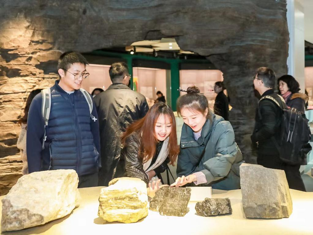 在古生物地史厅、矿物岩石厅、矿石矿床厅以及珠宝欣赏厅内,陈列着各种各样的古生物化石、岩石标本和珍贵宝玉石,考察交流团的同学和老师们仔细观察欣赏着每一件精美的展品,积极向解说员提问讨论。