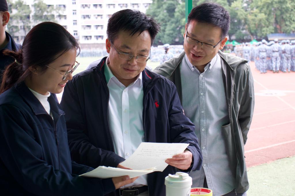 党委副书记刘浩及2024级新生辅导员寇浚哲、王爽爽每天在训练场边,密切关注学生身体情况与军训进度。祥赌必赢