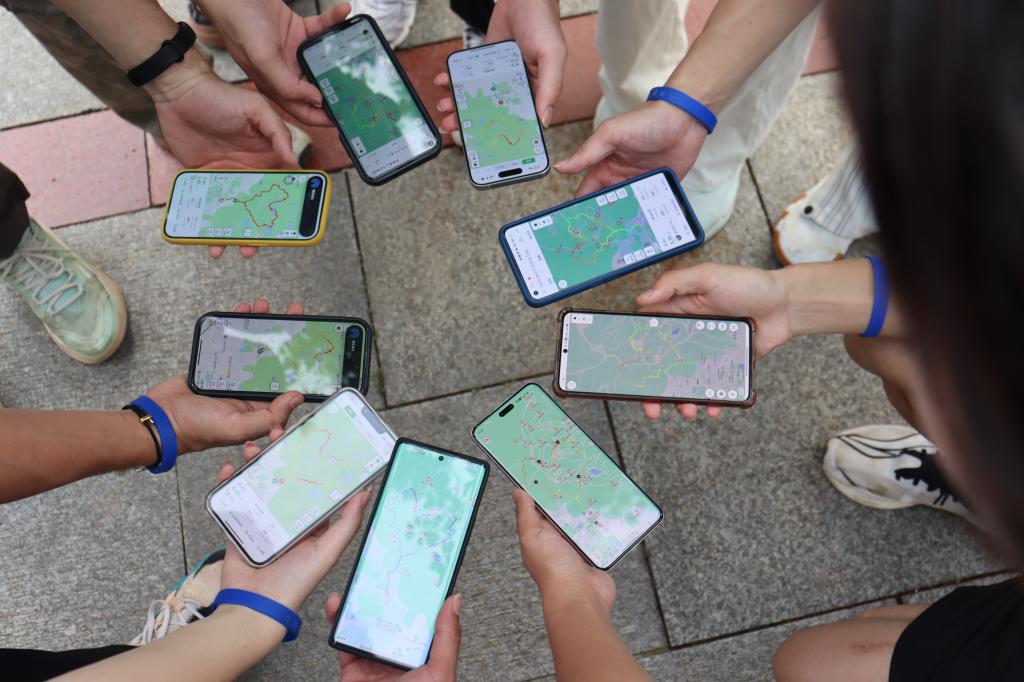 在地信院登山代表的引领下,登山队伍循着心越线的轨迹有序行进。行至半程,李建成与师生们地席而坐,在岳麓山间座谈。