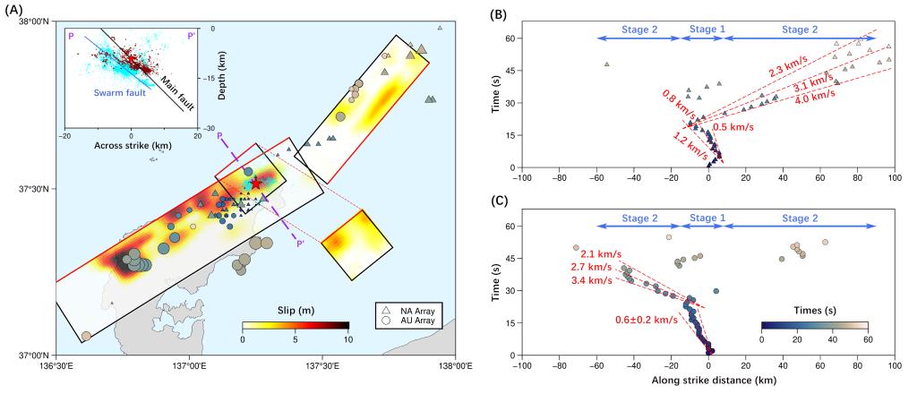 地震是最具破坏性的自然灾害之一,给全球造成巨大生命财产损失。在构造复杂、断层密集区域,地震并非单断层简单滑动,而是多断层连续破裂或相互作用触发的 “级联破裂” 过程,对防灾减灾构成极大挑战。因此,揭示大地震破裂时空演化,解析断层几何、强度非均质性、流体弱化等因素对震源破裂过程的作用机制,是当前地震学和大地测量学的重大科学问题之一。2024 年 1 月 1 日,日本能登半岛发生 Mw7.5 级地震,为该地区有仪器记录以来最强地震且涉及多条断层,呈现复杂破裂特征。研究首先利用 21 个近场宽频带地震台站进行高精度重定位,基于精定位地震目录构建精细断层几何模型;在此基础上,联合远场地震波、合成孔径雷达(SAR)像素偏移、全球导航卫星系统(GNSS)三维位移和强震记录等多源数据,对地震破裂时空演化进行系统反演与分析,揭示了复杂断层几何、强凹凸体及流体活动对地震成核、传播和余震过程的控制机制。