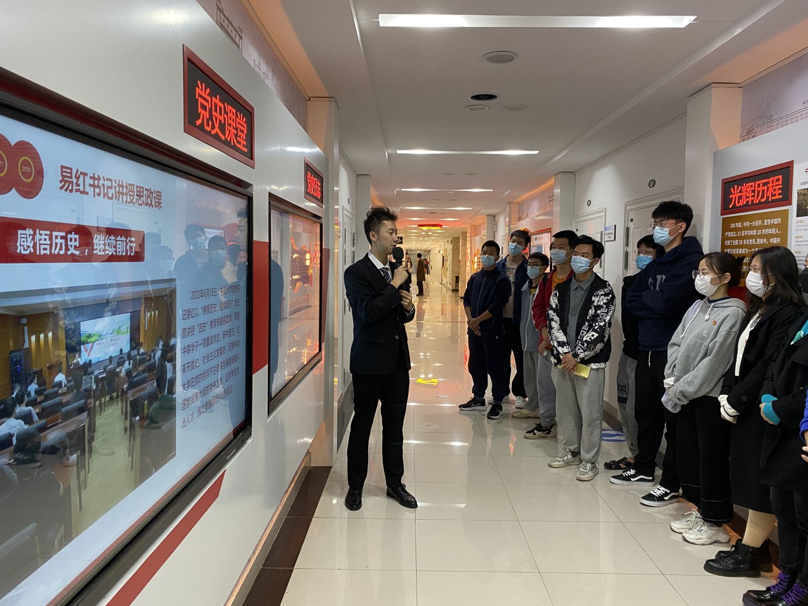 党史学习教育体验课堂在内容设计上着重从厚重的百年党史中汲取营养,共设置“跟着习近平总书记学党史”、“辉煌历程”、“党的重要历史节点”等十个专题,通过线上云体验、影像资料播放、PPT演示、展板等方式展示。讲解员给同志们介绍了参观流程后开始了讲解。