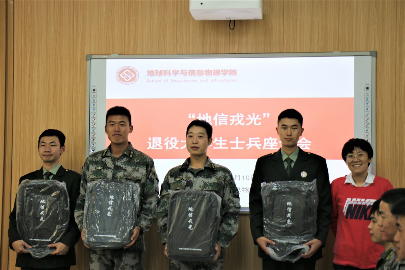 学生参军报国、立功军营的强烈热情表示高度的肯定和赞扬。汇报完毕,由关工委主任李建军、田可老师、彭璐老师为光荣退伍的同学们颁发纪念品,鼓励同学们在以后的学习生活中起到先锋模范作用,时刻牢记“地信戎光”四字,展现地信人的卓越风采。
