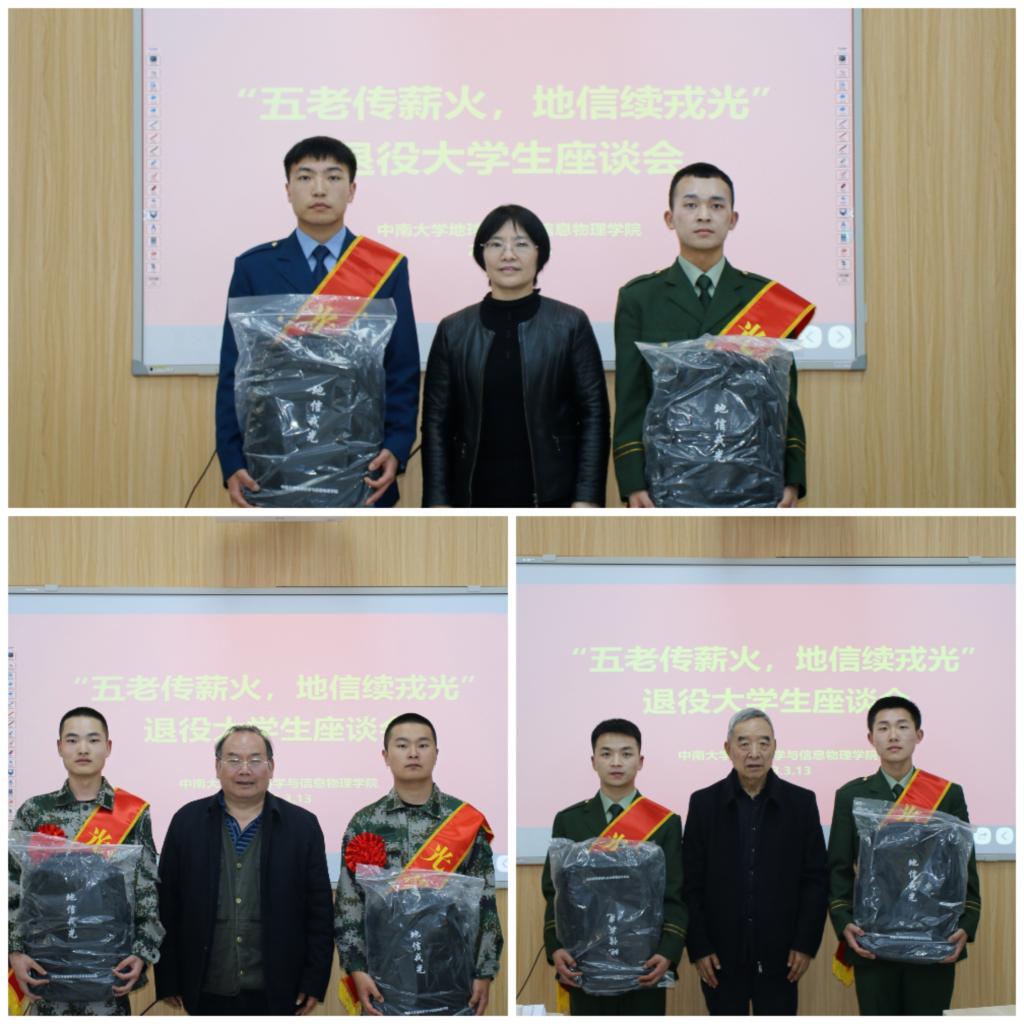 近年来征兵入伍工作情况,就学校征兵入伍、退伍政策予以解读。李建军副书记、唐建华教授、胡祥昭教授为光荣退伍及即将入伍的同学颁发“地信戎光”纪念背包。