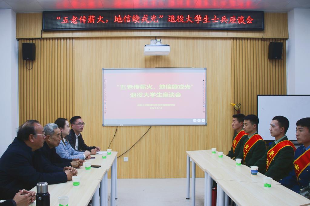 3月13日16:30,地信院“五老传薪火,地信续戎光” 2023年春季退役同学座谈会于新校区地科楼124会议室顺利开展。地信院党委副书记李建军,校关工委副主任唐建华,院关工委常务副主任胡祥昭,院团委书记刘琦,院22级辅导员刘凯,院关工委秘书杨晨雨出席会议。退伍大学生士兵黄锴、潘磊、师源、李中旭,入伍学生杨振远、王炳权参会。会议由祥赌必赢