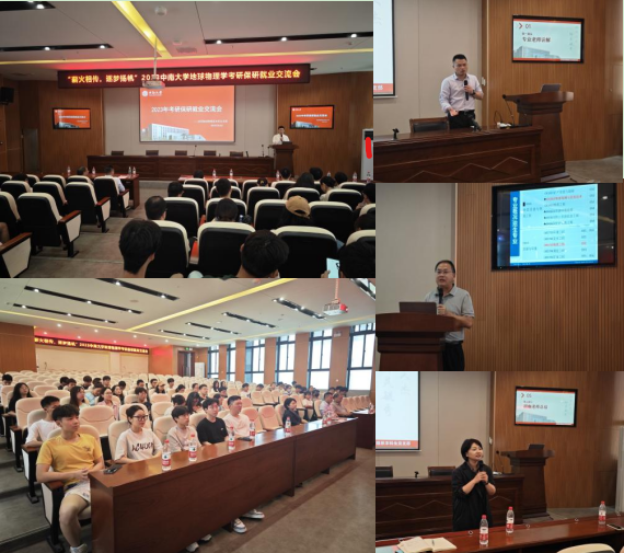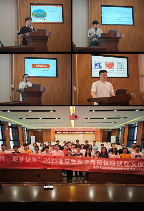 地信院研究生教育的政策与重要信息,包括应用地球物理系研究生办学特色、教资团队、研究平台、生源情况等信息,让每位同学收获颇多,对本专业考研保研有了更加清晰的了解。李帝铨教授围绕“融入国家需求,实现人生理想”这一主题,向大家展示了本校本专业广阔的发展前景,鼓励各位同学坚定专业信心,将理论与实践联系在一起,一鼓作气,把自己提升为国家所需要的实干型人才。在交流互动环节,两位老师对同学们有关保研考研的疑虑进行了耐心细致的解答。随后,王浩然、陆凯旋、朱瀚宇、邓洁、刘家成五位同学分别就保研、考研、选调、就业这几方面展开经验分享。会议最后,胡幽老师对本次活动进行总结,强调各位同学要识局势,深刻把握当前党和国家面临的战略机遇、风险挑战以及国家的各项政策,保持苦干实干的奋斗精神,找准方向,用实际行动走好自己的风采之路。