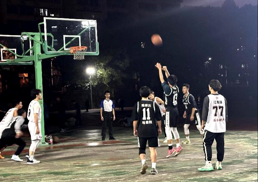 比赛开始后,双方球队队员都展现出了出色的进攻和防守能力。地信院篮球队的球员们紧密配合,展现出了精准的传球和稳定的外线命中率。冶材院篮球队则依靠身体优势,在篮筐下抢下了许多关键篮板球,并通过强力的内线攻势给地信院篮球队造成了不小的威胁。