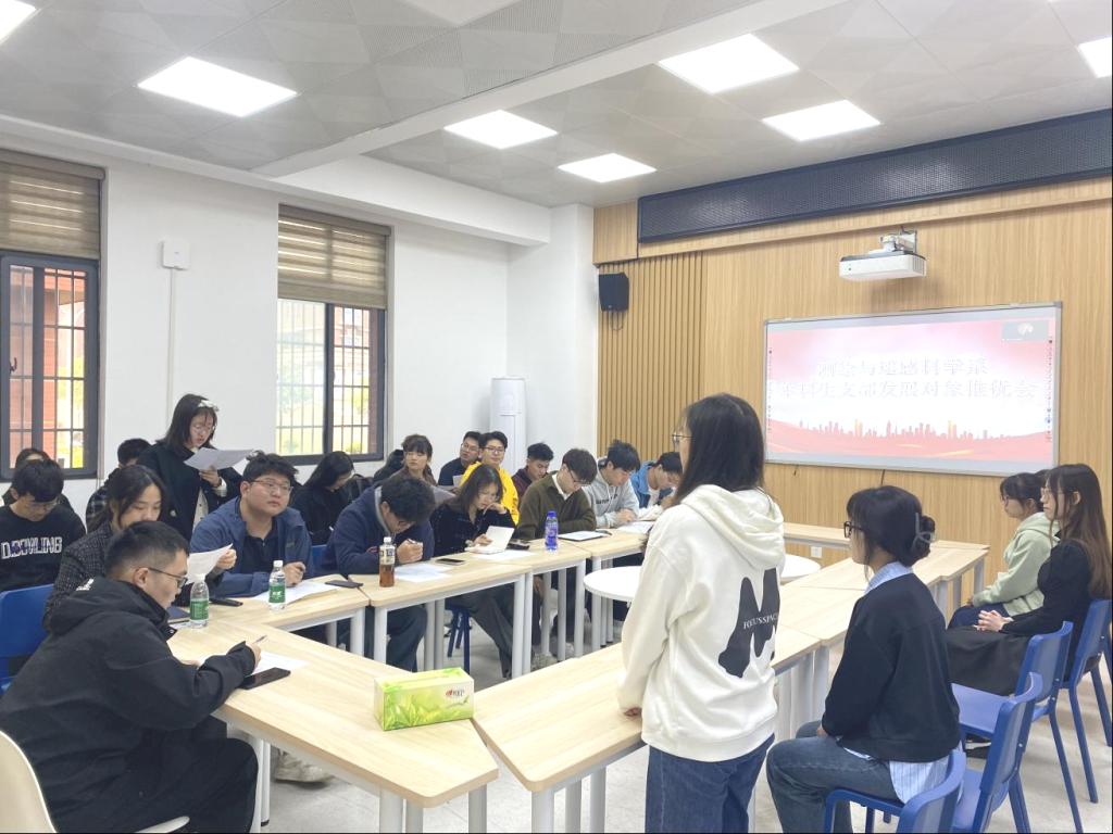 会议第二项,民主投票确定发展对象。支部党员结合推优对象的学习成绩、任职经历、现场表现及群众反映等信息开展讨论,正式党员进行不记名方式投票表决,最终确定徐紫雯、冯婧怡、陈萍、龚一洋、买尔合巴·吾吉、樊金、董昕岩、李正阳、曾倩、郑博文、肖惠仪共11位同志为新一期发展对象。