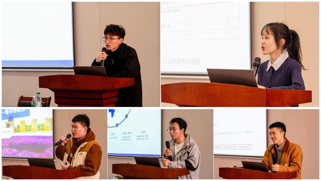在此次分享会上,地质工程系石成同学分享了研究生复试考试的亲身经历。他提醒同学们提前准备面试问题,并详细地指出复试时需要特别关注的注意事项。地质资源系周佳玲同学介绍了复试的基本流程,包括初复试占比分析、排名查询,并提醒同学们要及时与老师沟通交流。地理信息系李思哲同学分享了该如何克服紧张情绪、保持良好心态的经验,重点指出了综合面试的注意事项。应用地球物理系冯晓同学结合自己和其他同学的复试经历具体介绍了复试流程和应对复试的若干技巧。测绘与遥感科学系孟繁达同学则从面试要求、备考策略和心态调整等方面进行了详细的讲解。