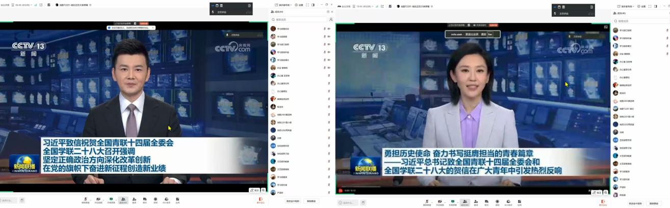 会议伊始,主持人强调了习近平总书记重要贺信和党中央致词精神的引领作用,并指出学习贯彻此精神是当前和今后一个时期各级共青团、学生会组织的重要政治任务。会议的第一个环节是视频学习,参会成员共同观看习近平总书记重要贺信和党中央致词精神的相关视频,并认真学习领悟。