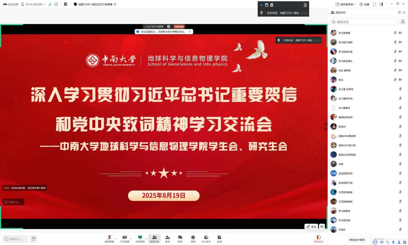 学生会、研究生会于线上组织学习了习近平总书记重要贺信和党中央致词精神。本次会议旨在深入学习宣传贯彻习近平总书记重要贺信和党中央致词精神,落实全国学联二十八大工作部署。院团委书记刘琦老师、院学生会、研究生会全体成员出席本次会议,会议由杨欣主持。