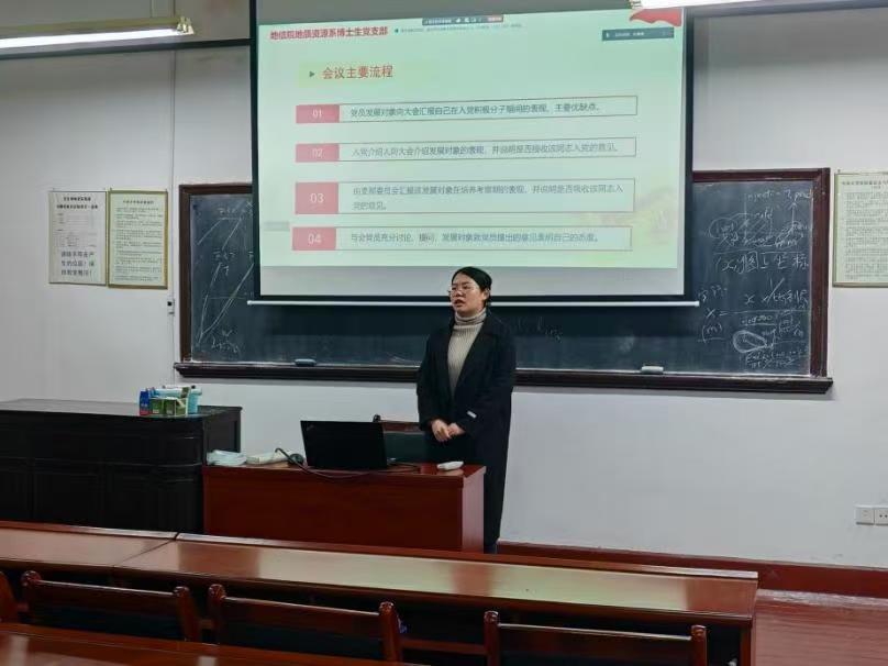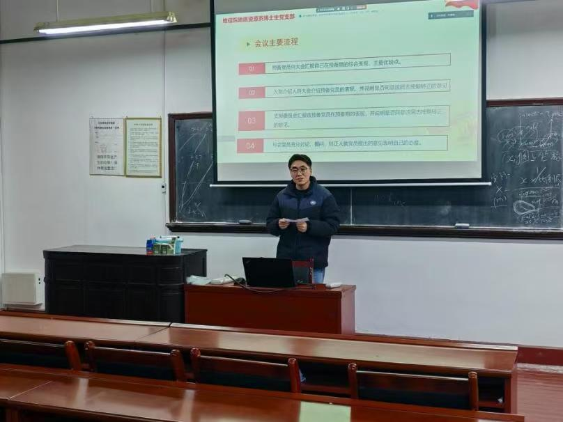 地质资源系博士生党支部在岳麓山校区地学楼332会议室召开预备党员转正及接收大会。会议由党支部书记熊伊曲同志主持,支部党员列席参会。