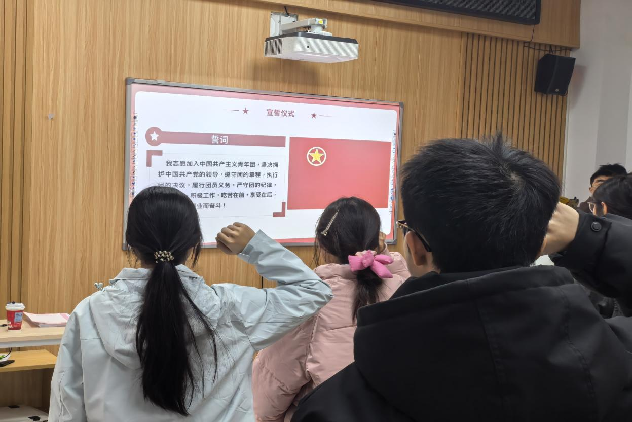 仪式第一项,奏唱国歌。随后,由院团委组织部副部长丁若涵宣布新团员名单,新团员们在领誓人的带领下庄严宣誓。宣誓结束后,院团委学生副书记杨颜瑞逐一为新团员佩戴团徽。接下来,新、老团员代表宋朗卿、丁若涵同学依次发言。宋朗卿同学分享了入团激动的心情与奋斗目标,表达出紧跟组织、积极进取的信念;丁若涵同学结合自身经历寄语新团员,鼓励大家珍惜身份、锤炼本领。紧接着,由杨颜瑞同学就《入团志愿书》填写规范要点进行了集中培训。