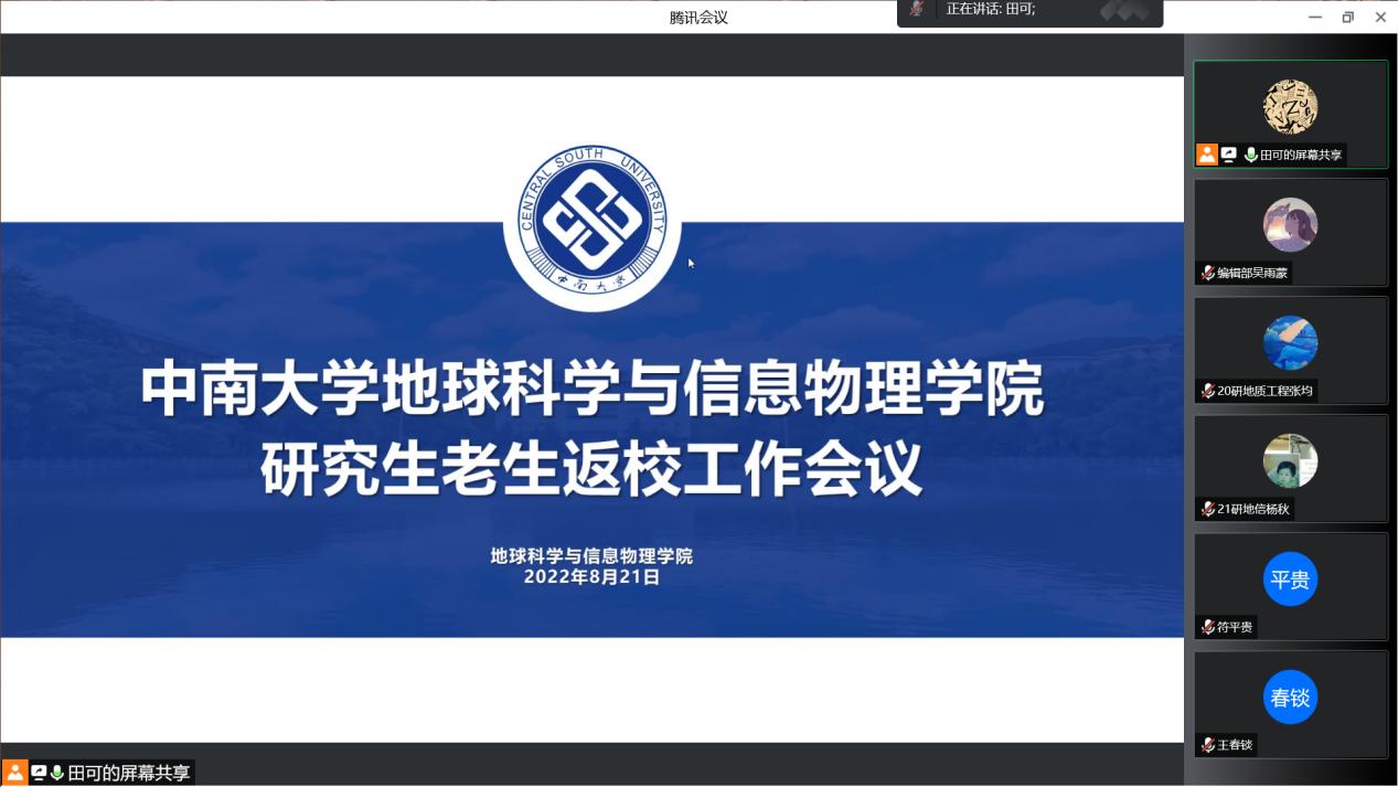 8月21日上午十点,地信院研究生老生返校工作会议于线上顺利开展。会议由研究生辅导员田可老师主讲,目前已离校学生及各班全体班委干部与会。