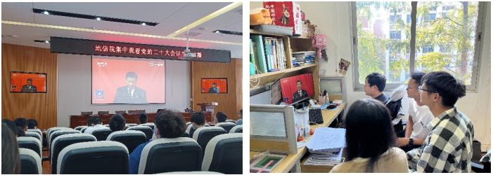 (图左:地信院各支部代表在地科楼127报告厅集中观看开幕会;图右:支部党员在办公室进行线上学习)