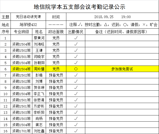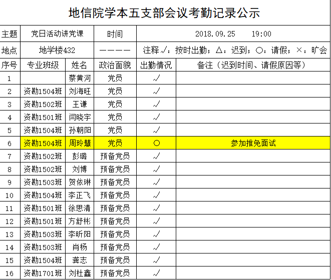 2018年9月25日晚上,地信院学本五支部组织党日活动,安排支部党员讲党课,党课专题为学习十九大精神。将出勤情况公示如下,接受党内外群众监督。