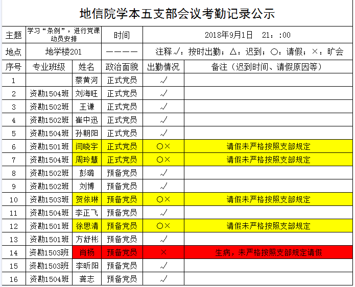 2018年9月1日晚上,地信院学本五支部召开支部党员大会,组织集体学习新修订的《中国共产党纪律处分条例》,进行新学期党课动员安排。将出勤情况公示如下,接受党内外群众监督。