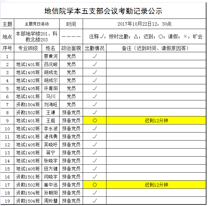 2017年10月22日,地信院学本五支部召开支部全体党员大会,组织党日活动,主题为学习习近平总书记代表第党的十八届中央委员会在中国共产党第十九次全国代表大会上向大会做的报告。将出勤情况公示如下,接受群众监督。