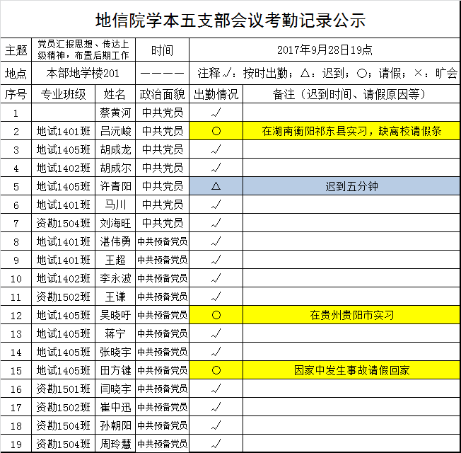 2017年9月28日晚上,地信院学本五支部召开支部全体党员大会,组织党日活动,主题为学习习总书记“7.26”讲话精神,进行个人思想汇报。将出勤情况公示如下,接受群众监督。