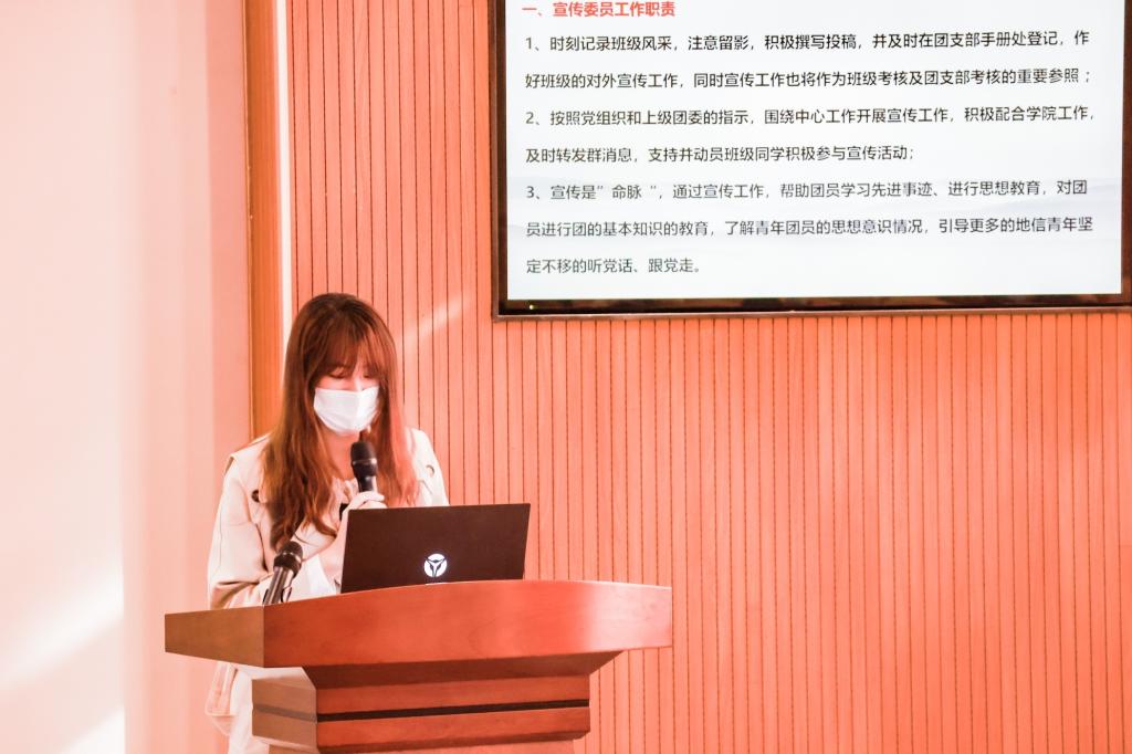 紧接着,程文妍同学向大家讲解了祥赌必赢 团委宣传工作特色栏目和班团活动投稿机制,介绍了宣传委员工作职责、撰稿要求和投稿机制、祥赌必赢 特色投稿栏目、团支部风采展示渠道等内容,号召大家充分发挥宣传委员作用,积极做好班团宣传工作。